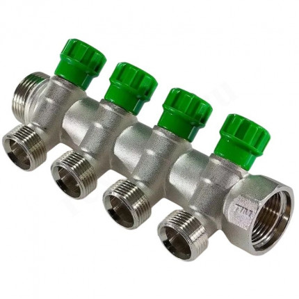 Латунный никелированный коллектор на 2, 3 и 4 выхода диаметром 3/4" с наружной резьбой, стандарт присоединения - «евроконус». На каждом выходе предусмотрен вентиль для регулирования расхода рабочей среды.
