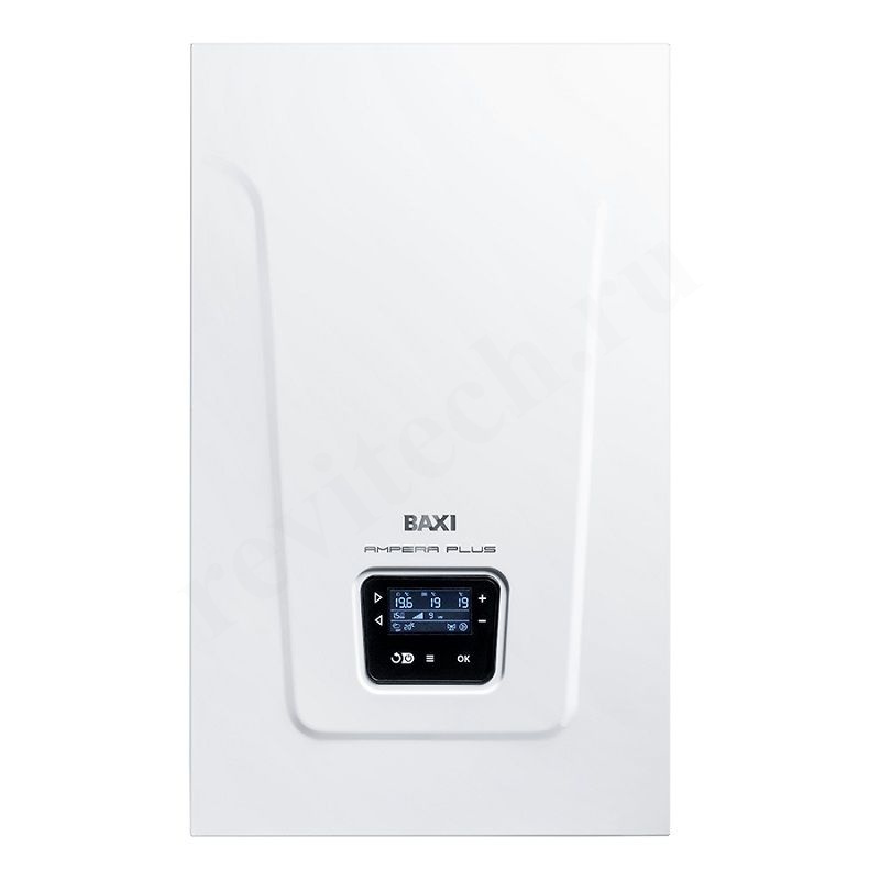 Электрический котел BAXI AMPERA Plus – это современная мини-котельная, которая включает: расширительный бак, насос и группу безопасности. • Cиловая часть и блок управления выполнены на отдельных платах; • Силовые реле оснащены индивидуальной термической защитой и винтовым соединением контактов; • Независимый расцепитель, срабатывающий при отказе реле и аварийном перегреве котла; • Силовые реле рассчитаны на 40 А и имеют двукратный запас по номинальному току; • Блок питания электроники котла имеет встроенную стабилизацию напряжения и систему защиты от импульсных помех и работает в диапазоне входных напряжений 85-305 В; • Нагревательный элемент из нержавеющей стали с низкой удельной тепловой напряженностью и долгим сроком службы. • Гидравлическая группа из стали; • Трёхскоростной энергосберегающий циркуляционный насос с напором 6 м; • Отдельный автоматический воздухоотводчик в верхней часть котла; • Расширительный бак – 12 литров; • Возможность установки внешнего трехходового клапана для подключения бойлера (опция); • Манометр; • Возможность удалённого управления и мониторинга через протокол OpenTherm системой BAXI Connect+; • Цифровая индикация температуры; • Возможность подключения комнатного термостата. Комплектация: Котел электрический - 1 шт Датчик температуры воздуха BAXI Ampera - 2 шт Предохранитель 2А/250V 5x20 - 2 шт Шуруп 3х20 с пластиковым дюбелем - 4 шт Шуруп 6х50 с пластиковым дюбелем - 2 шт Кронштейн настенный L=300 - 1 шт Отвертка - 1 шт Уплотнение кольцевое силиконовое G2 - 1 шт Перемычка (6-9 кВт) - 1 шт Руководство по установке и эксплуатации (паспорт изделия) - 1 шт Упаковка - 1 шт