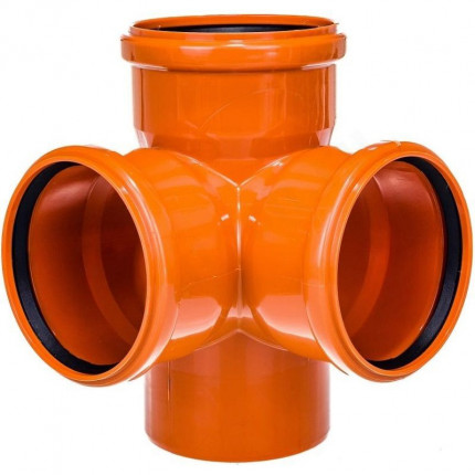 Крестовина двухплоскостная 110/110/110 х 87° имеет четыре ответвления равного диаметра 110 мм, три из которых являются входом и одно - выходом (равнопроходная крестовина). У такой крестовины диаметры обоих ответвлений равны диаметру основного стояка.