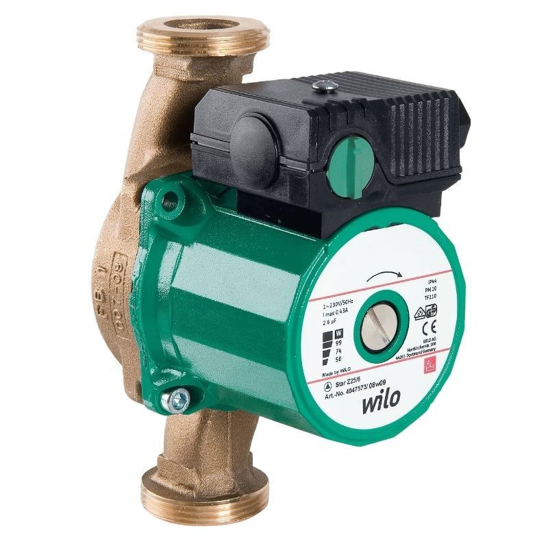 Циркуляционный насос для систем ГВС, насос с мокрым ротором с постоянной частотой вращения для установки в трубах. Устойчивый к токам блокировки электродвигатель. Корпус насоса из бронзы, рабочее колесо из упрочненного стекловолокном синтетического материала, керамический вал с угольными подшипниками скольжения, пропитанными синтетической смолой.