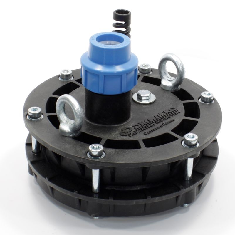 Оголовок позволяет предохранить скважину от попадания в нее поверхностных грунтовых вод и посторонних предметов. Использование оголовка позволяет увеличить надежность подвешивания насоса и упростить эксплуатацию технического колодца, кессона, а также позволяет надежно крепить трос к насосу посредством карабина, подвешиваемого на нижний рым-болт.