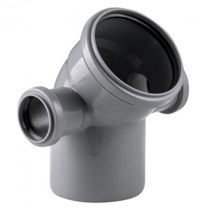 Отвод канализационный Ростурпласт диаметром 110 мм под углом 45 градусов для монтажа систем внутренней канализации. Имеет выходы слева и справа для трубы диаметром 50 мм.