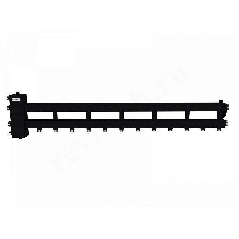 Балансировочный коллектор BM-100-7D представляет из себя гидрострелку с распределительным коллектором на 7 контуров, 6 из которых направлены вниз (или вверх при развороте на 180° по горизонтальной оси) и 1 в сторону.