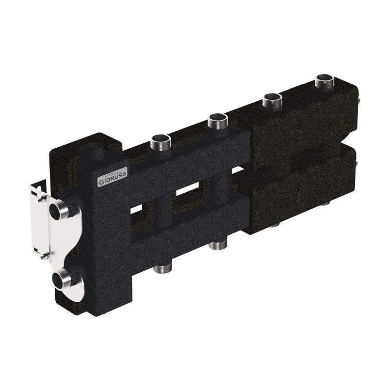 Коллектор с гидрострелкой и термоизоляцией BM-60-5DU.EPP (до 60 кВт, вх. G 1″, 2+2+1 контура G 1″, EPP-термоизоляция) объединяет в себе функционал гидрострелки и коллектора на 5 контуров G 1''.