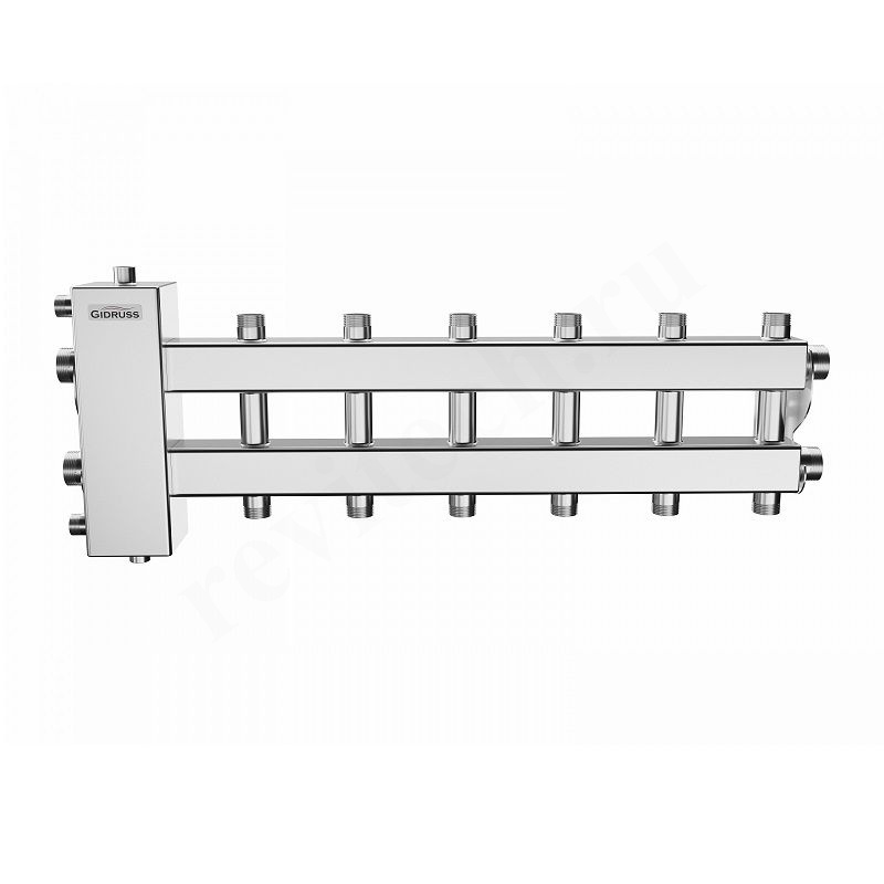 Нержавеющий балансировочный коллектор BMSS-100-7DU представляет из себя гидрострелку до 100 кВт с распределительным коллектором на 7 контуров, 3 из которых направлены вниз, 3 вверх и 1 в сторону. Боковой контур повышенной производительности G 1¼″ позволяет подключать мощные потребители, такие как теплообменники для подогрева бассейнов и вентиляции, а так же расширять кол-во потребителей при расширении хозяйства путем транзитного присоединения дополнительной секции модульных коллекторов MKSS-100.