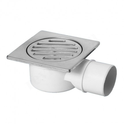 Трап напольный с металлической (полированная нержавейка) решеткой 100х100мм; высота 62мм; выход Дн=50мм; цвет-хром